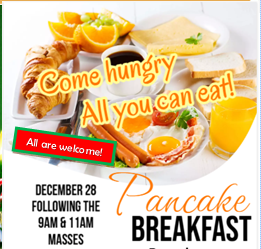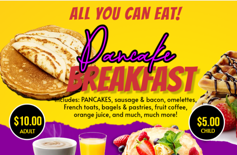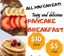 Come and join our delicious Pancake Breakfast! We will have pancakes, French toast, sausage, bacon, omelets, bagels, fruit, pastries, juice, and coffee.