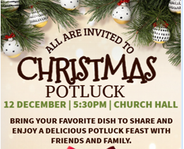 Join us on December 12 for a festive Christmas Potluck at church! Bring your favorite holiday dish to share and enjoy an evening filled with warm fellowship, delicious food, and the joy of the season. We’ll also have a fun gift exchange, so bring a small wrapped gift if you'd like to participate. Come celebrate Christmas with us—everyone is welcome! 🎄✨